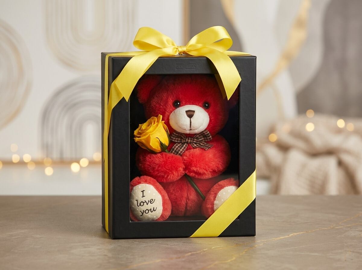 情熱的な赤いテディベアが、エレガントな黒のプレゼンテーションボックスに収められた美しいイエローのプリザーブドローズを抱えた、上質なロマンティックギフトです。クリーム色の肉球には「I love you」の刺繍が施され、愛の気持ちをストレートに伝えるデザイン。花彩喜(はなさき)がお届けする、長く美しさを保つプリザーブドフラワーと愛らしいテディベアの組み合わせは、永遠の愛を象徴する特別な贈り物です。